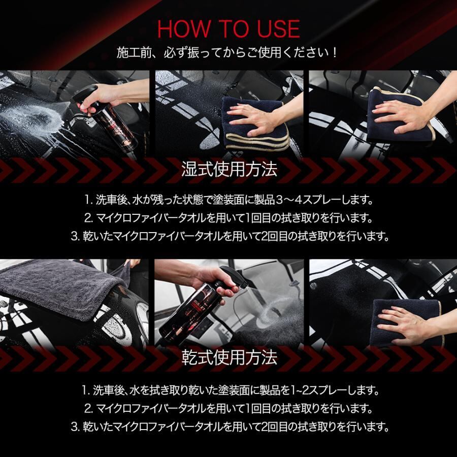 1.洗車後、水気を拭き取り、乾いた塗装面に本製品を1〜2回スプレーします。